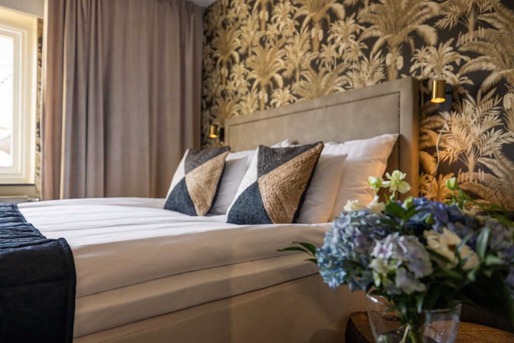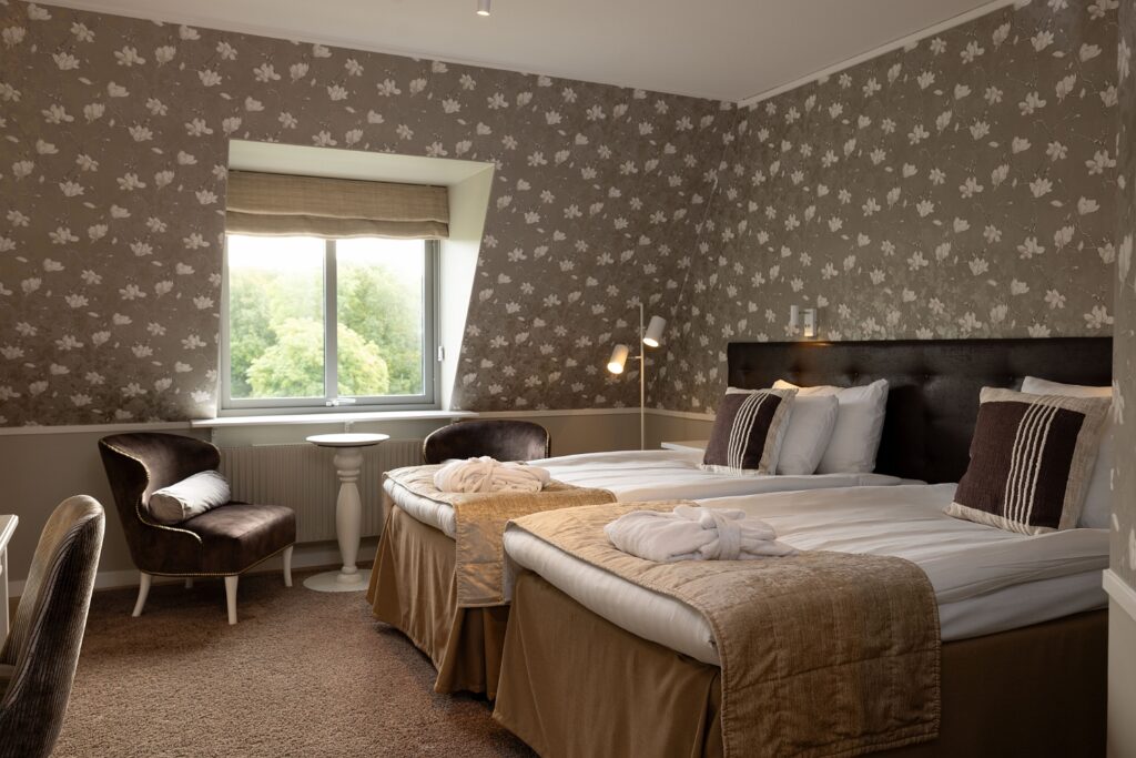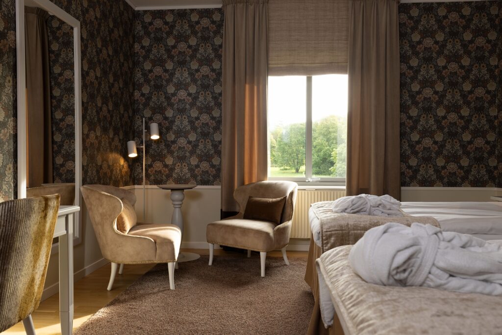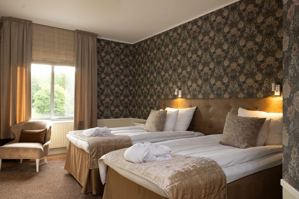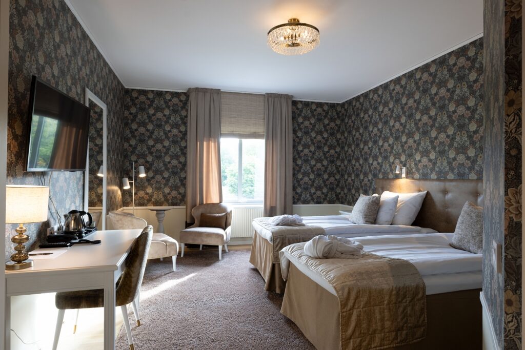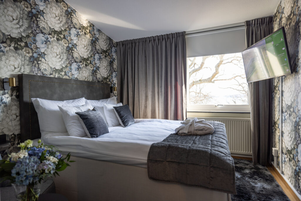 Tidigare i våras öppnade vi de nyrenoverade hotellrummen på korridor 300 och 400 för sina första gäster. Totalt 20 vackra rum, fördelat på 19 dubbelrum och en Junoir suite twin. Alla med enastående utsikt över Edsviken och närhet till både lobbyn och relaxavdelningen. Efter sommaren kunde vi även stålt presentera 23 nyrenoverade twin rum i Stora Annexet. Detta var två av de tre sista etapperna i vårt projekt att renovera alla våra hotellrum, nu återstår endast 5 hotellrum i Lilla Annexet att renovera av totalt 126 rum! Lilla Annexet har däremot fått ett lyft under våren i väntan på den stora makeovern. Vår inredningsarkitekt Agneta Thögersen som driver Intero Interiör har som vanligt hjälpt oss inreda i en mycket smakfull stil med jordnära färger, vackra tapeter och stilfull inredning.