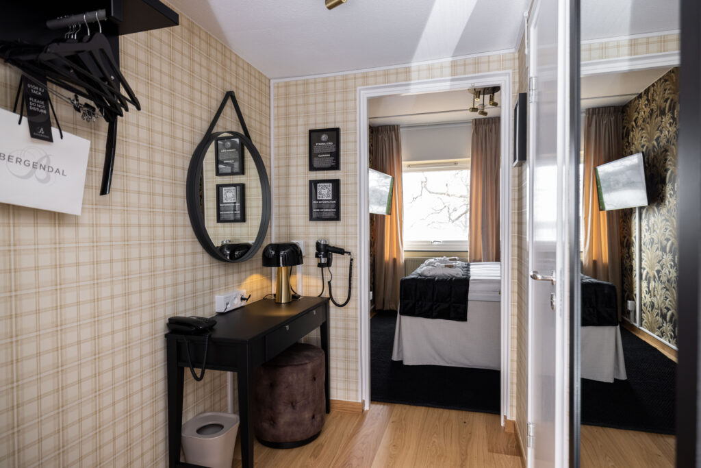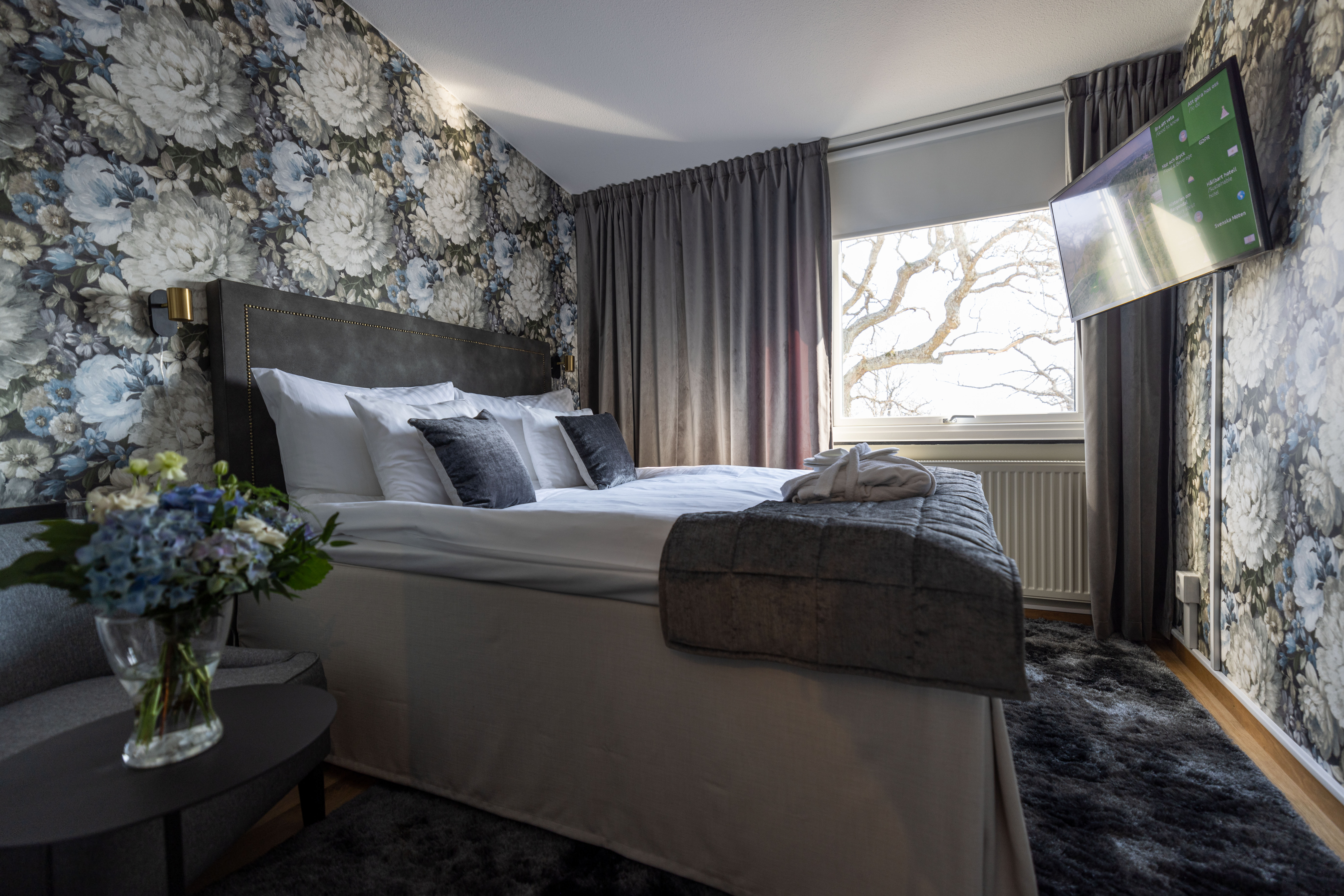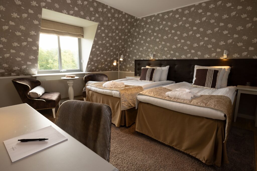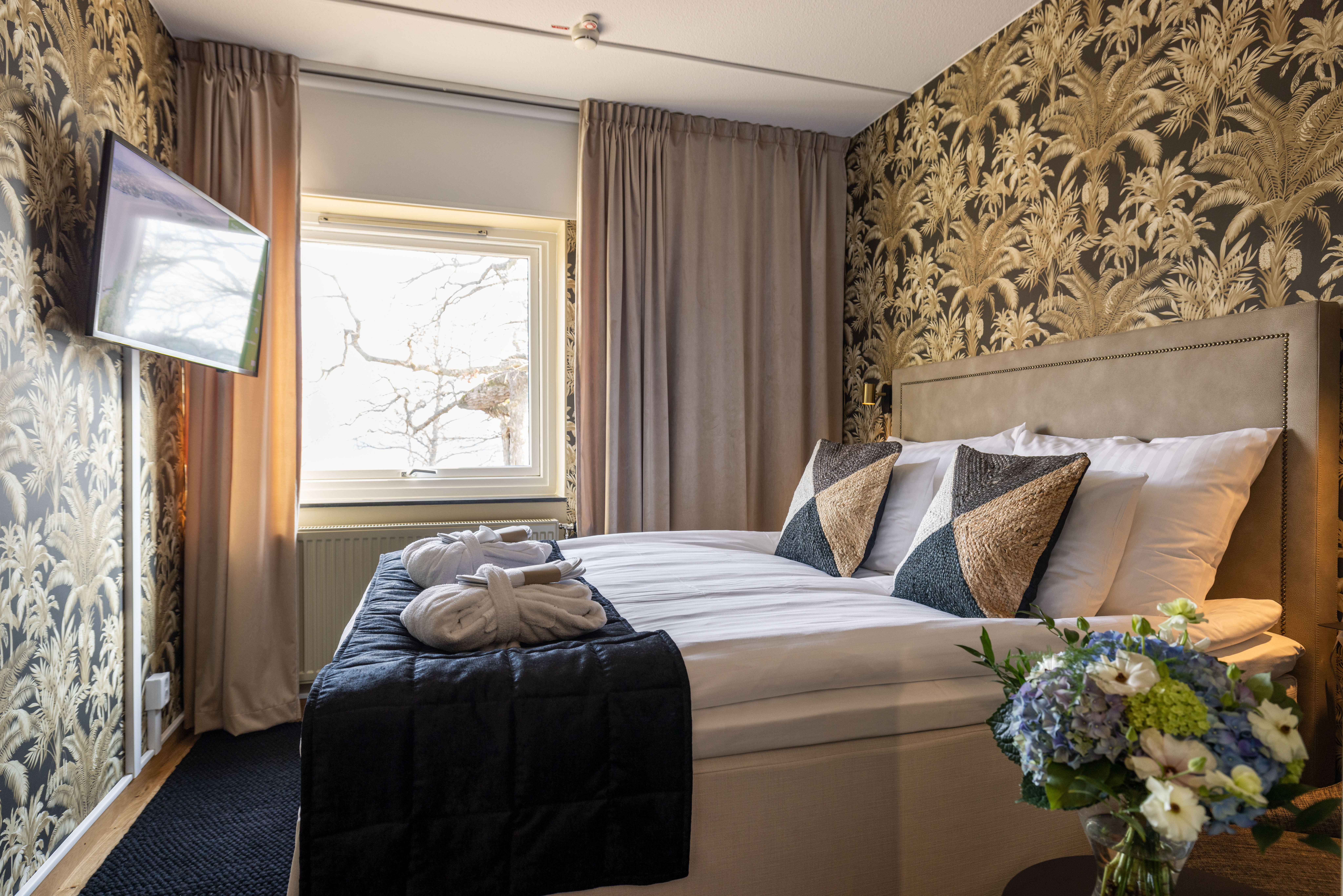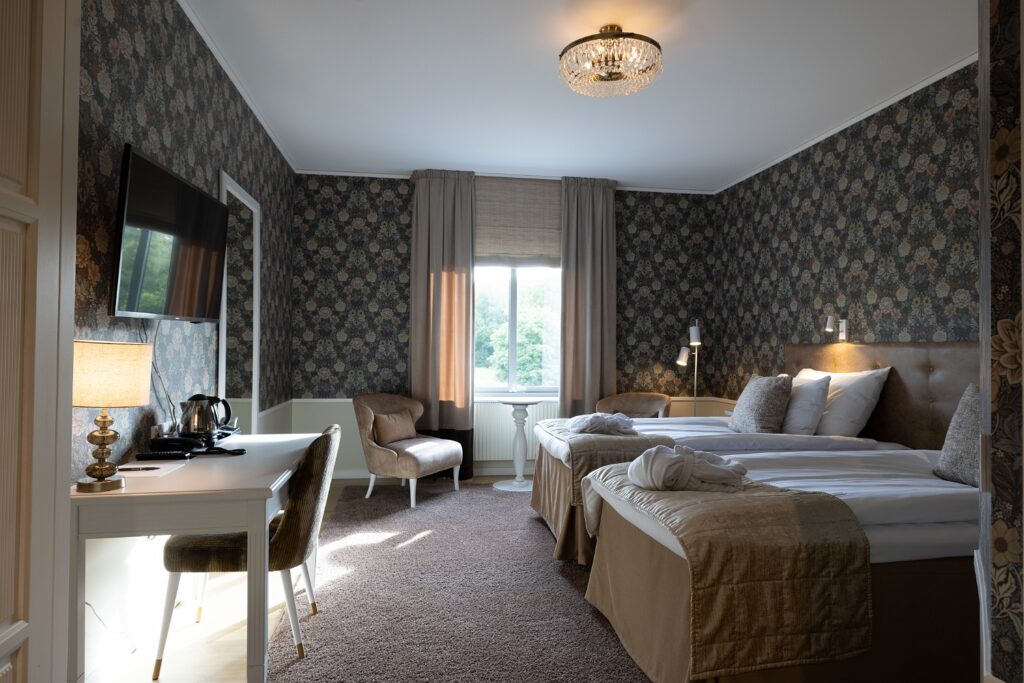 Tidigare i våras öppnade vi de nyrenoverade hotellrummen på korridor 300 och 400 för sina första gäster. Totalt 20 vackra rum, fördelat på 19 dubbelrum och en Junoir suite twin. Alla med enastående utsikt över Edsviken och närhet till både lobbyn och relaxavdelningen. Efter sommaren kunde vi även stålt presentera 23 nyrenoverade twin rum i Stora Annexet. Detta var två av de tre sista etapperna i vårt projekt att renovera alla våra hotellrum, nu återstår endast 5 hotellrum i Lilla Annexet att renovera av totalt 126 rum! Lilla Annexet har däremot fått ett lyft under våren i väntan på den stora makeovern. Vår inredningsarkitekt Agneta Thögersen som driver Intero Interiör har som vanligt hjälpt oss inreda i en mycket smakfull stil med jordnära färger, vackra tapeter och stilfull inredning.